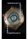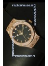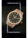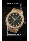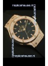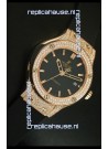 Rose Gold Plating on Solid Stainless Steel Case with Hublot Markings and Engraving. Diamonds Encrusted Case and Bezel.
