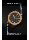 Black Rubber Strap with Rose Gold Plated Steel Clasp complete with Hublot Markings and Engravings.