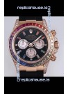 18K 10.0 Microns Thick Rose Gold Plating on 904L Solid Stainless Case with Rolex Markings and Engravings like the Authentic. High Quality Swiss Cut Diamonds on Watch Casing