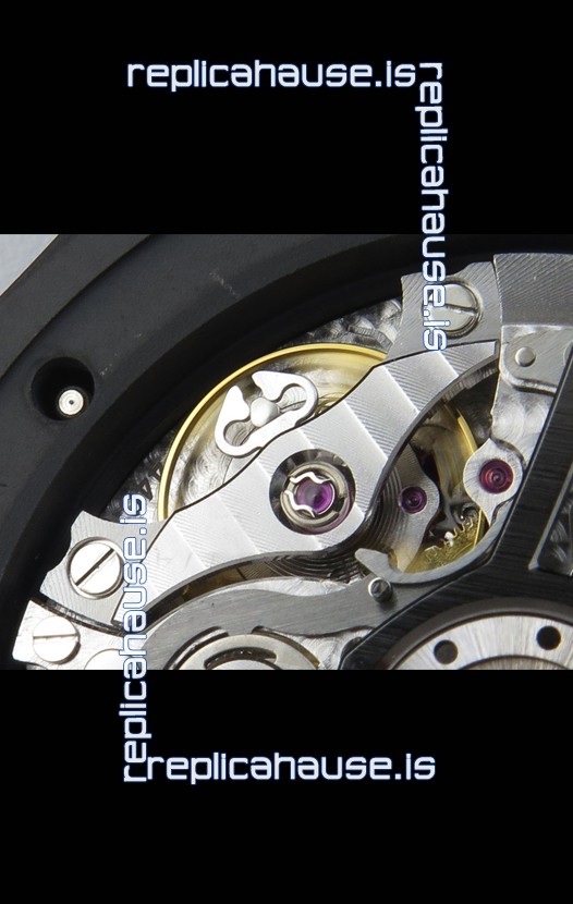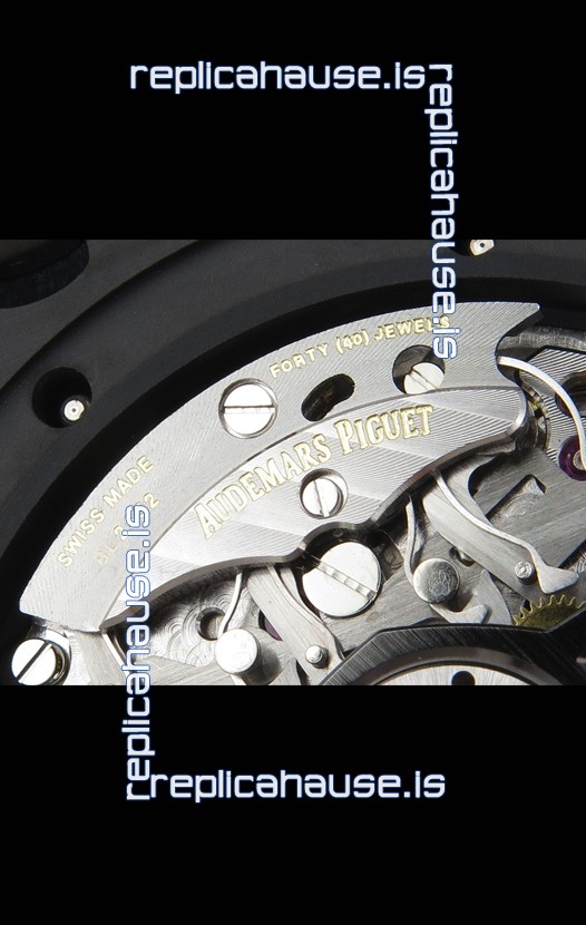 Machinery Layout exactly like Audemars Piguet 3126 Calibre Movement used in Authentic Audemars Piguet Offshore Watches. Built on Genuine Swiss 7753 Movement architecture with Functional stopwatch feature like the authentic with Seconds hand running at the 12 o clock Sub Dial