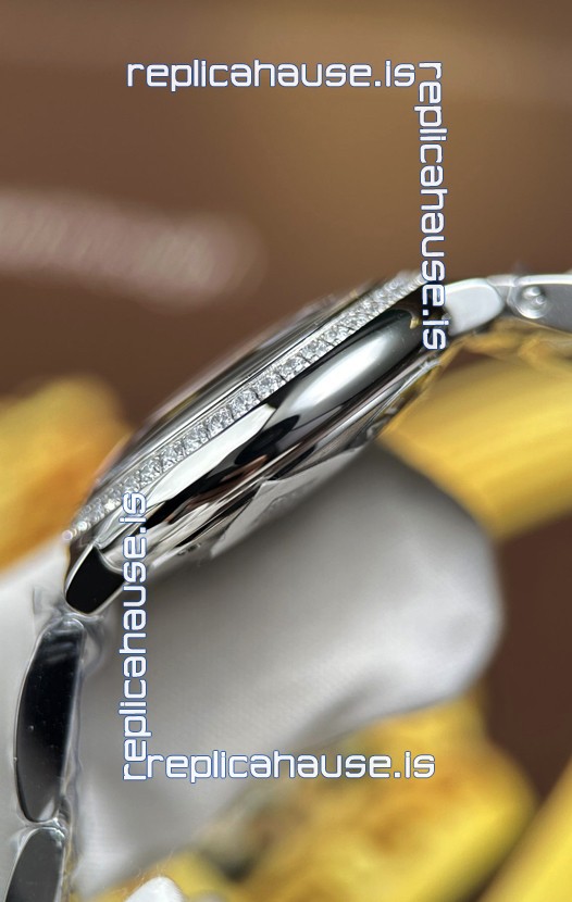 Steel Pink Dial with Roman Hour Markers. Diamonds Bezel