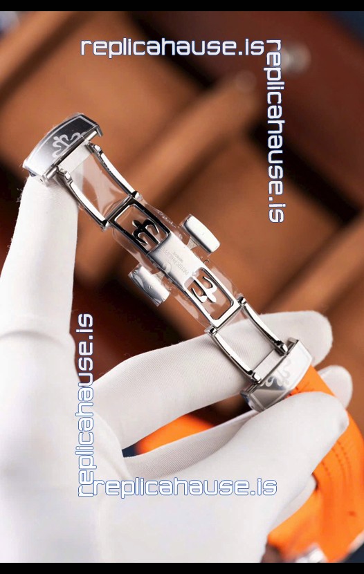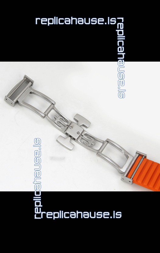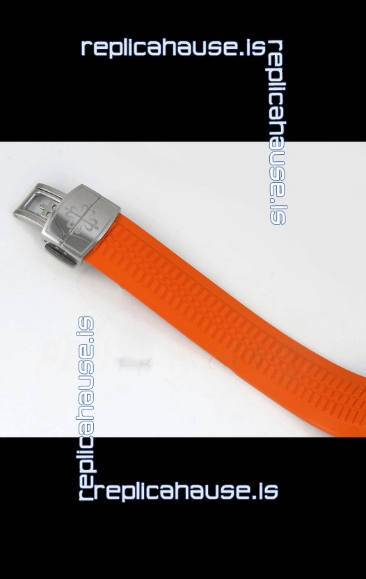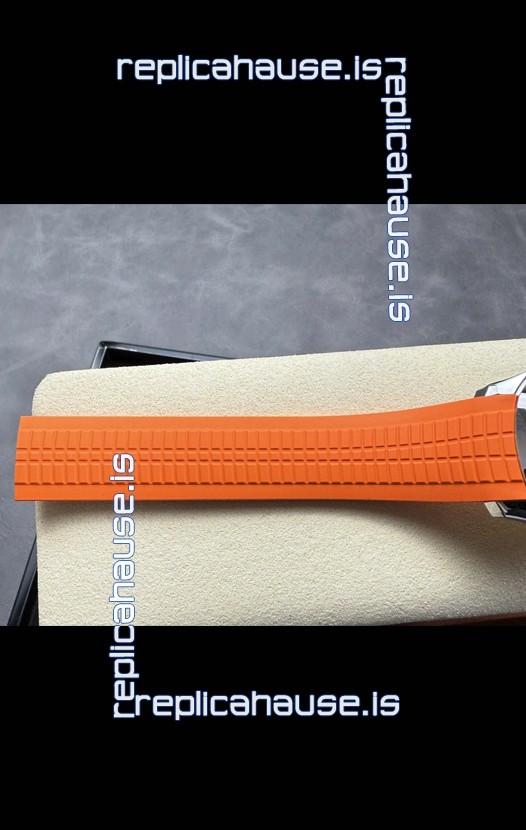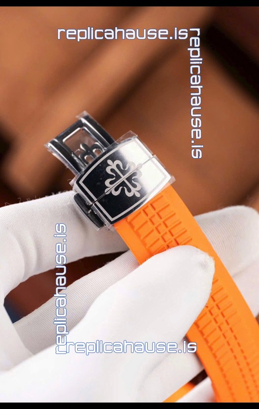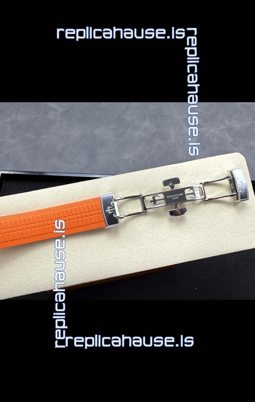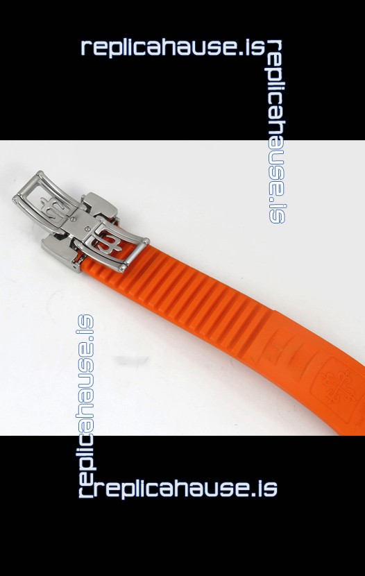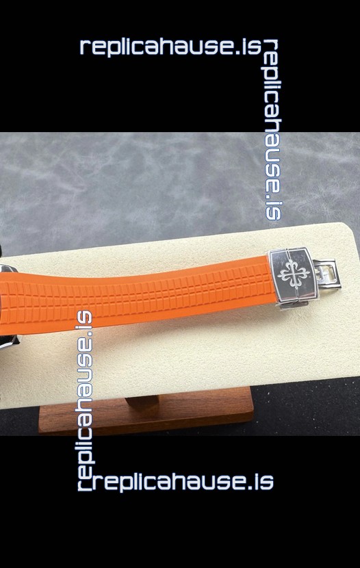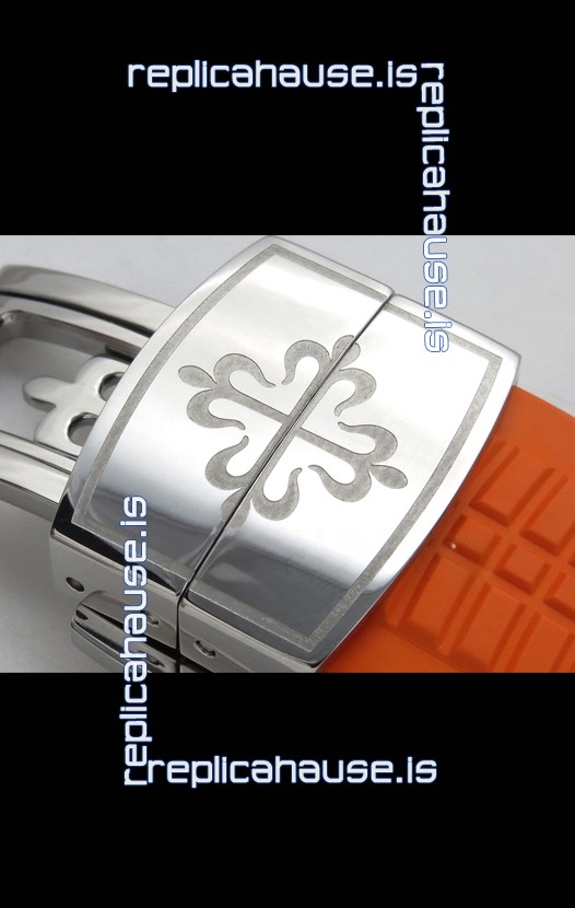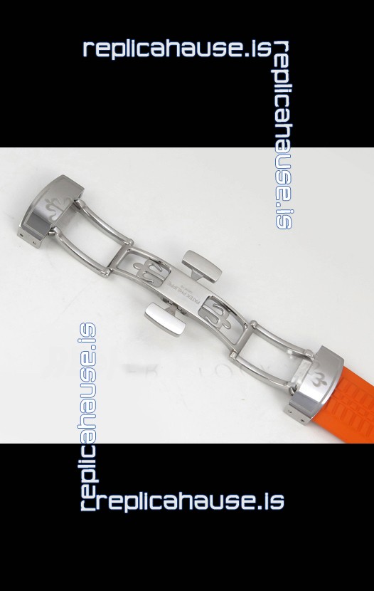 Curved Rubber Strap with Steel Folding Clasp complete with Patek Philippe Markings. A Highly Updated Clasps for this series with much more accurate markings/engravings.
