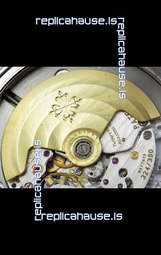 Genuine Swiss 9015 Movement assembled to Resemble the Authentic Patek Philippe PP 324 CS Calibre Style Movement. Updated Rotor, Bridged and Engravings on Movement.
