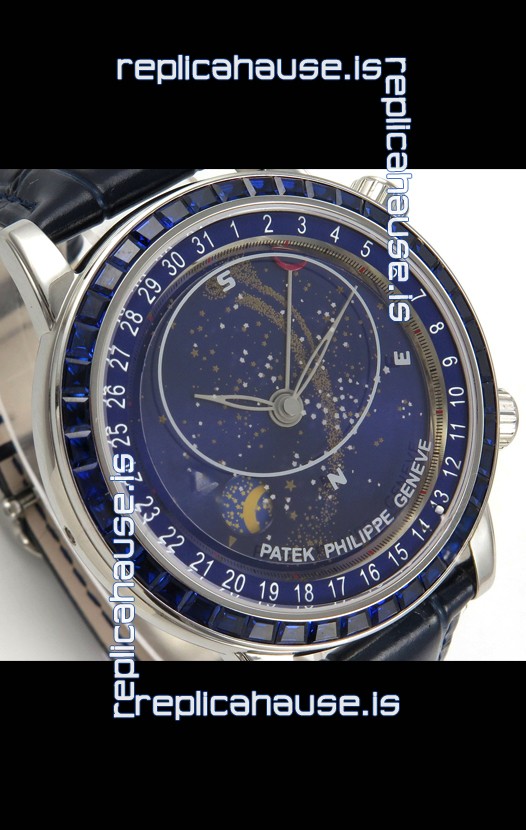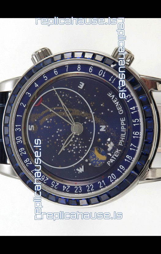 Blue Sky Moon Celestial Dial with Date Numerals around the Dial. Sapphires Bezel