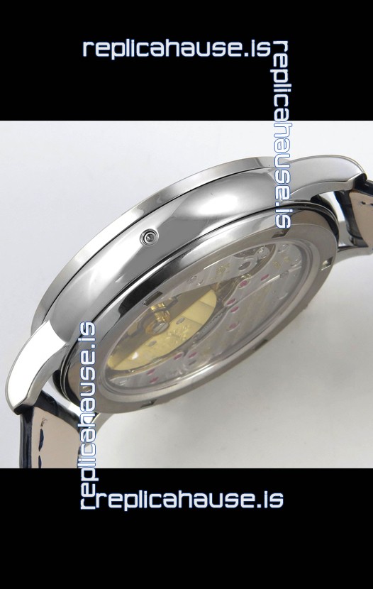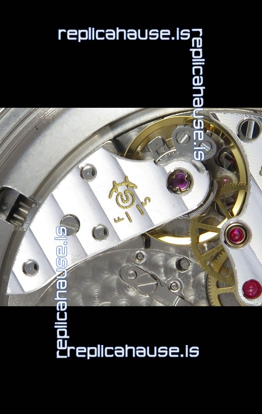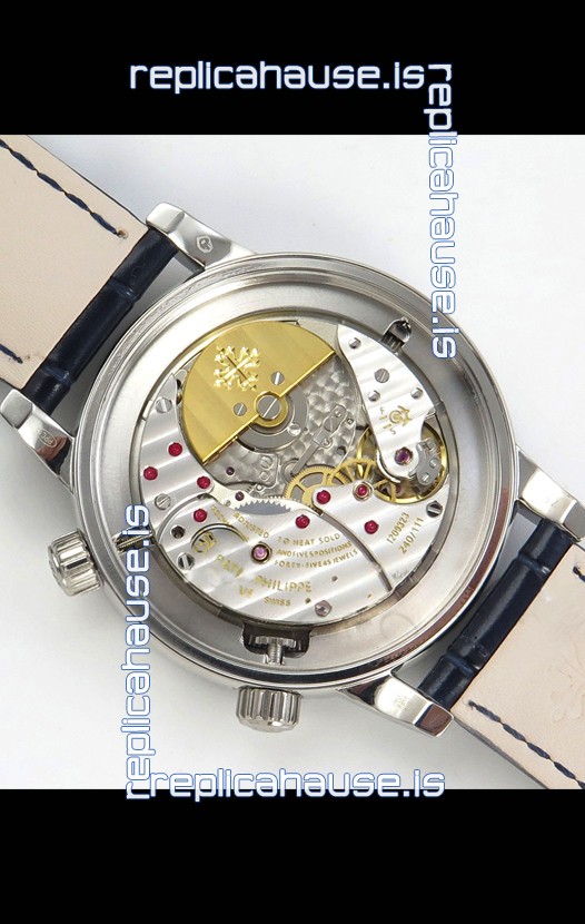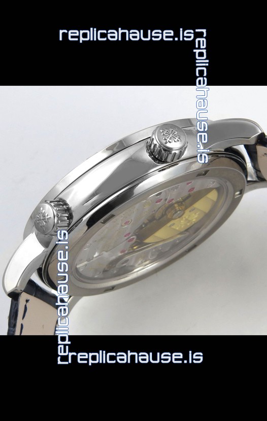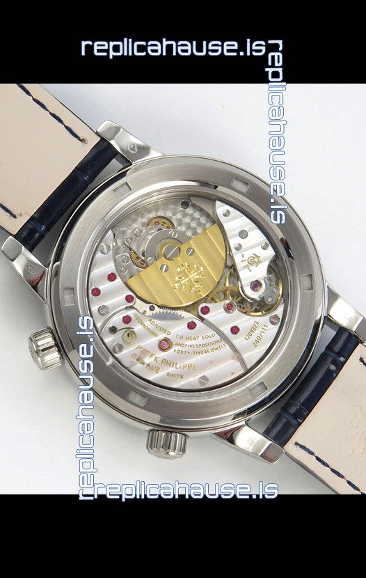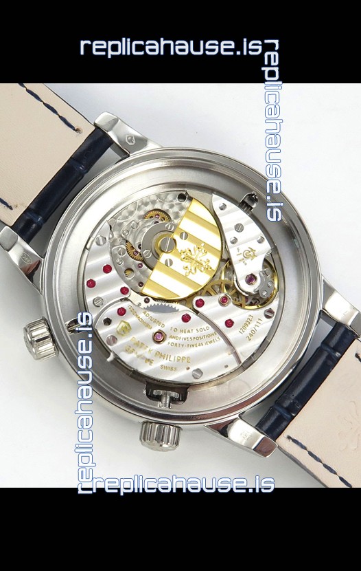Genuine Swiss 9015 Movement assembled to Resemble the Authentic Patek Philippe PP 240 Calibre Style Movement. Updated Rotor, Bridged and Engravings on Movement with Rose Gold Plated Patek Philippe Stamped Rotor