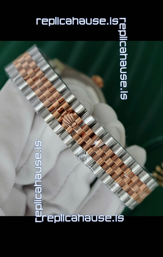 18K Rose Gold Plating on 904L Stainless Steel Two Tone Strap with New Style Rolesor Deployant Buckle, End links match up Flush with the Case. - A Much Improved Datejust Strap Version