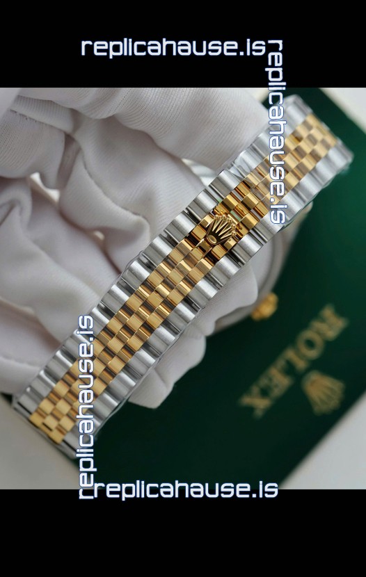 18K Yellow Gold Plating on 904L Stainless Steel Two Tone Strap with New Style Rolesor Deployant Buckle, End links match up Flush with the Case. - A Much Improved Datejust Strap Version