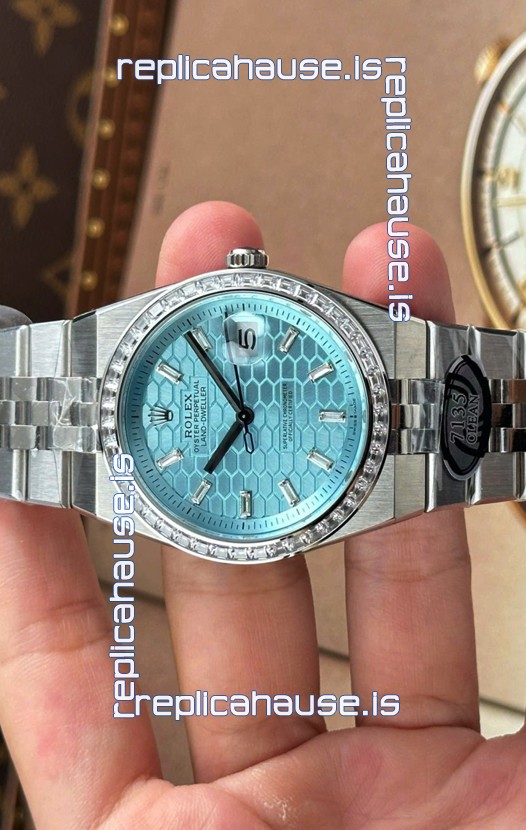 Ice Blue Honeycomb dial with Date Indicator. Diamonds Bezel